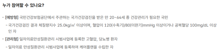 예방형은 만 20세에서 64세 사이의 일반 건강검진 수검자 중 BMI가 25 이상이거나 혈압·공복혈당이 주의 범위에 있는 분들이 대상이죠. 관리형은 고혈압이나 당뇨병 환자 중 일차의료 만성질환관리 사업에 등록된 분들이 참여할 수 있어요.