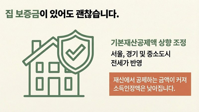 - 차량 가액 공제: 10년 이상 된 노후 차량은 재산 산정에서 제외되거나 감면율 확대.