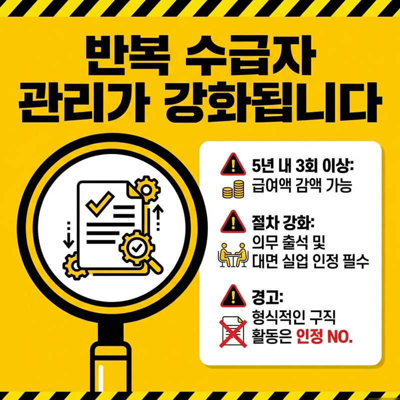 2026년부터는 실업급여를 반복해서 받는 분들에 대한 심사가 매우 까다로워졌어요. 반복 수급자의 경우 실업 인정 전 회차를 반드시 고용센터에 방문하여 대면으로 진행해야 할 수도 있어요. 또한 재취업 활동 증빙 자료를 제출할 때 형식적인 구직 활동은 인정되지 않을 가능성이 큽니다.