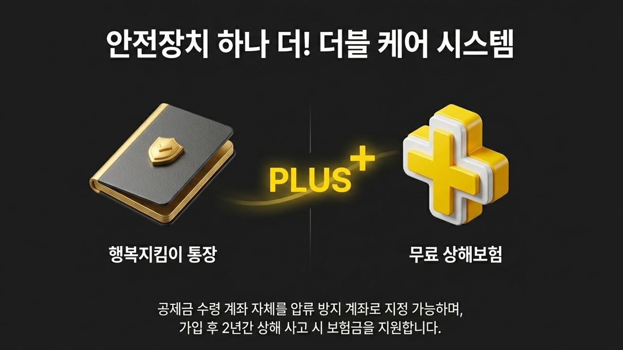 더 확실한 보호를 원하신다면 행복지킴이 통장을 개설해 보세요. 공제금을 받을 계좌 자체를 압류 방지 계좌로 지정하면 법률적으로 보호를 받을 수 있거든요. 이외에도 가입 후 2년 동안은 무료 상해보험 혜택도 제공하니 안전장치가 두 배로 탄탄해진답니다.