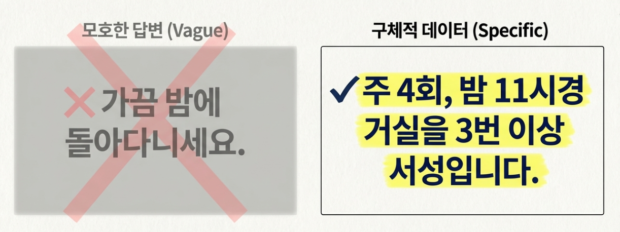 답변을 할 때는 '가끔 그래요'라는 표현보다 구체적인 횟수와 상황을 말씀해 보세요. '밤에 자다가 일어나서 거실을 3번 이상 서성인다'처럼 말이죠. 조사가 끝난 후에는 조사원에게 어르신을 돌보며 겪는 가족의 심리적 부담도 충분히 설명하는 것이 좋아요.