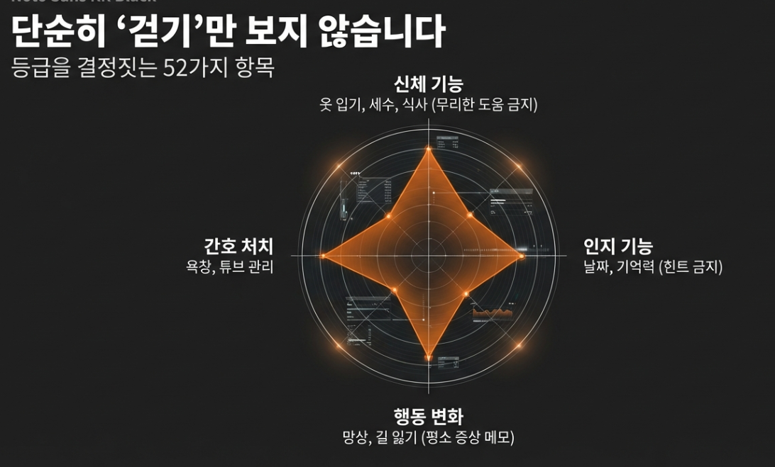 | 수발 부담 | 가족이 어르신을 돌볼 때 느끼는 힘들고 고된 정도 | 등급 판정 시 고려 대상 |