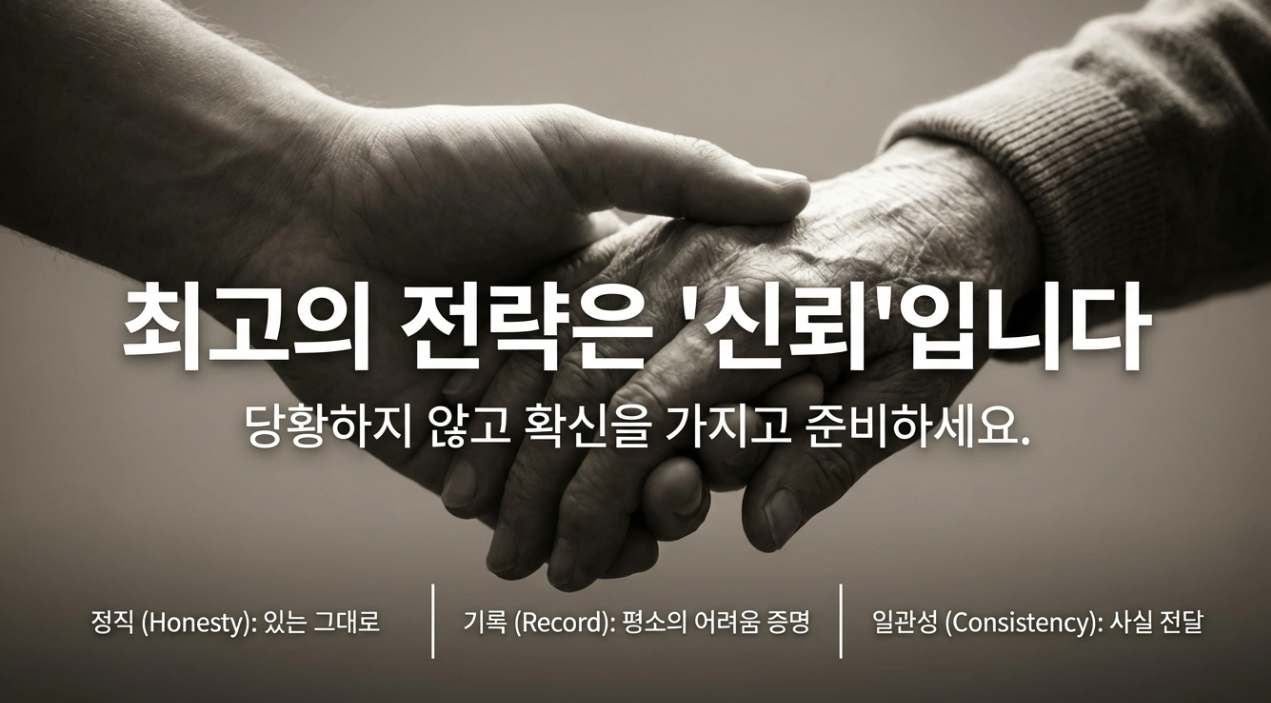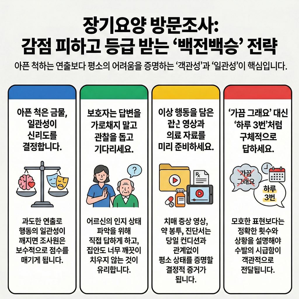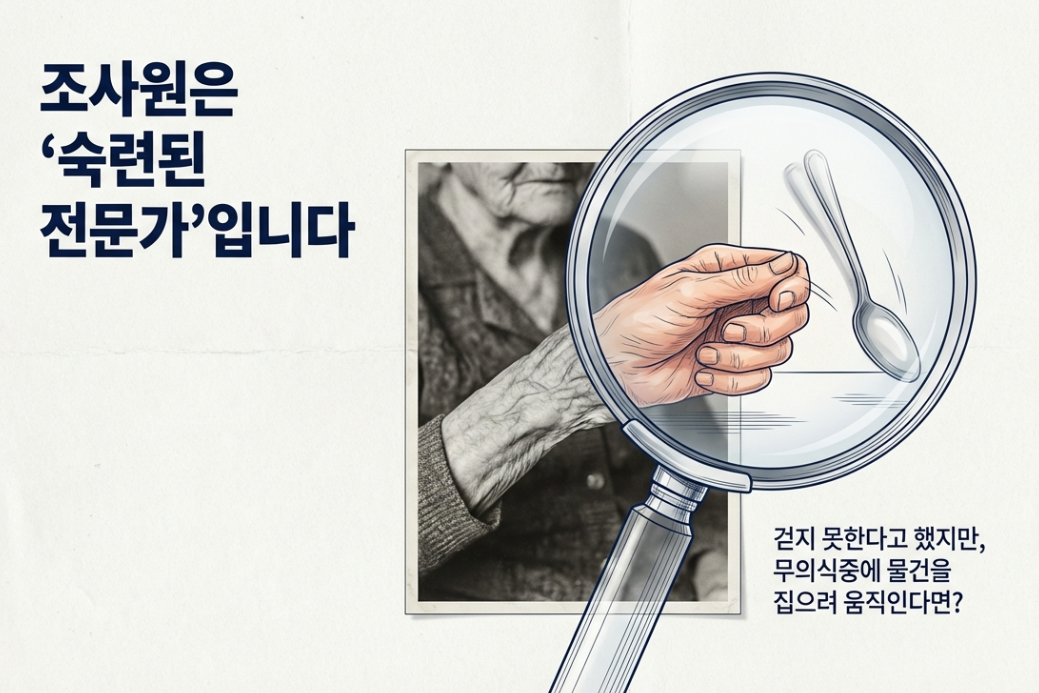 조사원은 수많은 어르신을 만나온 숙련된 전문가라는 점을 기억해야 해요. 어르신이 평소와 다르게 과도하게 아픈 척을 하면 조사 과정에서 일관성이 깨지게 돼요. 예를 들어 걷지 못한다고 하셨는데 무의식중에 물건을 집으려 움직이면 신뢰도가 급격히 떨어지죠.